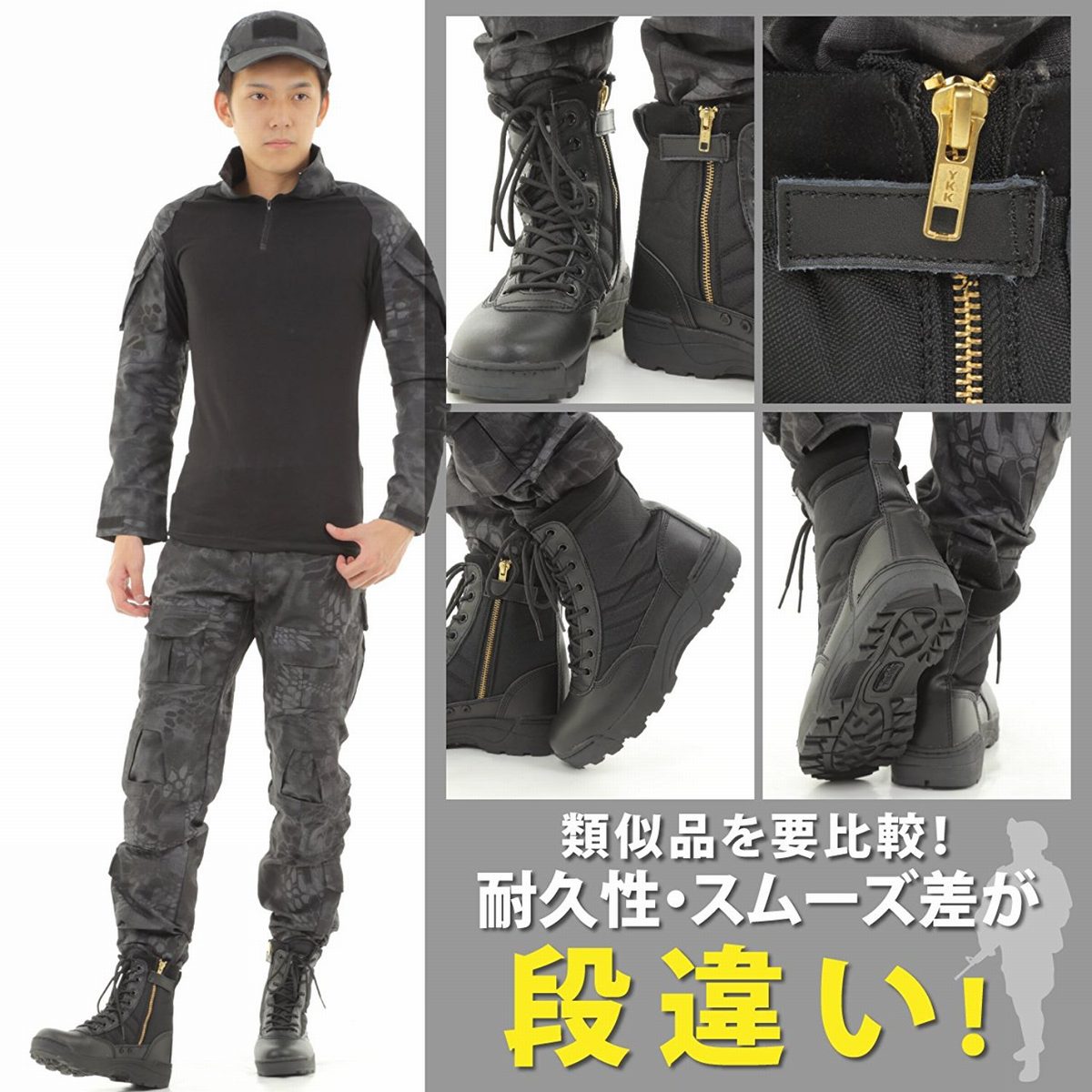 メーカー希望小売価格はメーカーカタログに基づいて掲載しています商品内容(セット内容) ・タクティカルブーツ サイズ・重量 【サイズ】 24.5cm(39) 25.0cm(40) 25.5cm(41) 26.0cm(42) 26.5cm(43) 27.0cm(44) 27.5cm(45) カラー ブラック / TAN 商品説明 忠実に再現した超本格S.W.A.T.タイプ サイドジッパー付きタクティカルブーツです。